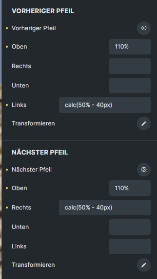 Danach positionieren wir die Buttons darunter (110% von oben), und mittig (50%) und ziehen dann die Breite der Pfeile ab, damit diese nicht genau in der Mitte übereinander stehen. Ich hab hier 40px abgezogen, damit dazwischen ein Abstand ist.